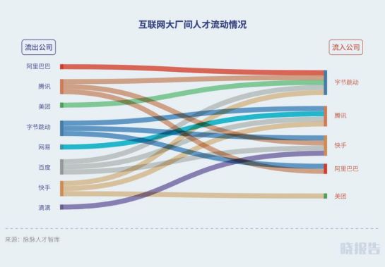 那么从阿里出走的员工一般都去了哪?据吴晓波频道此前发布的报告显示,“大厂”、“名厂” 之间的人才通常会欢快地“互通有无”,其中提到字节的人才首要来自阿里巴巴,员工跳槽会首选腾讯。