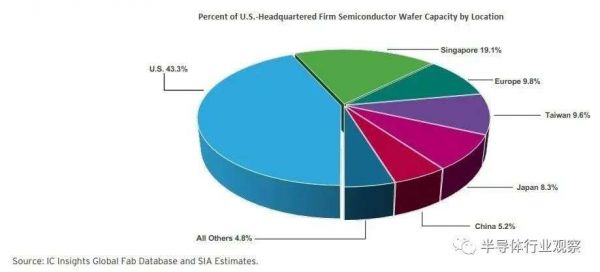据IC insights数据,2021年,大约19.1%的美国总部企业的前端半导体晶圆厂产能位于新加坡。2021年,新加坡约占全球晶圆制造产能的5%。