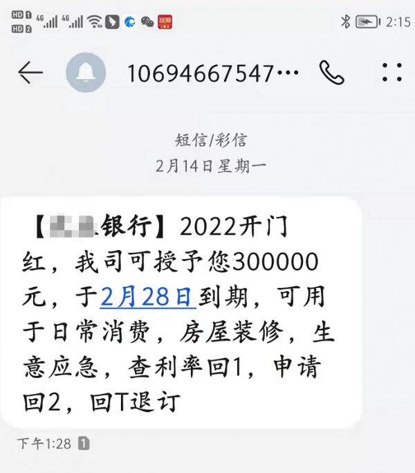 “2022开门红,我行可授予您48万元,可用于日常支出,建筑装饰,生意应急,查利率回复1,申请回2,回T退订。”