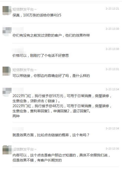 相比赵某一百万条四万五的价格,小刘称短信都是走量的,量大优惠;价格也是阶梯式的,客户没有号码库代发的价格是一百万条五万块,但是短信回复率可以达到千3至千6(一千条短信有3至6个人回复),有些小城市号码的回复率可能会更高一些。