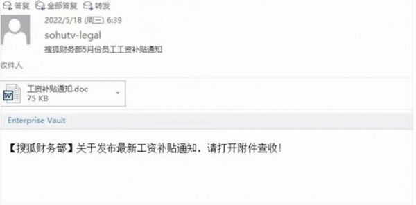 数名搜狐员工向界面新闻记者证实确实收到了该邮件。一名搜狐员工表示,公司在18号早晨9点发布全员预警,请员工不要点击该钓鱼邮件。