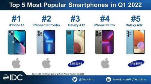 这几天 IDC 发布了 2022 年第 1 季度最畅销智能手机排行,前五名中苹果就占了 3 个,iPhone 13、iPhone 13 Pro Max 和 iPhone 13 Pro 分列第一、第二、第四名。