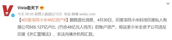 这件事平息过后,4 月 30 日,印度又冻结了小米约 48 亿人民币的账户资产。