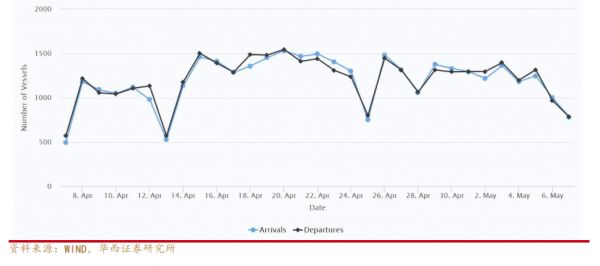 而外贸货物吞吐量占全国约10%的上海港,5月初,港口轮船到达/离开数在800以下,明显低于上海疫情前约2000的中枢值。