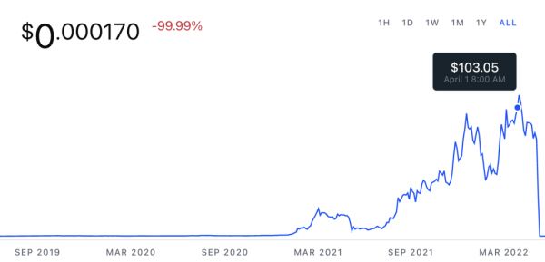 由斯坦福计算机大神 Do Kwon 建立的区块链系统代币LUNA曾在一年多里涨了近200倍,最高的时候一度超过110美元,被中文炒币者简称为「币圈茅台」。但大厦建得太快,崩塌起来往往更快。5月8日由于短时间内的集中兑换,疯狂的增发直接带崩了LUNA的价格,这一崩盘就是三天内跌走95%,实现了字面意义上的一文不值。