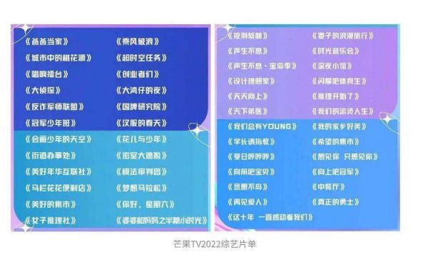 但相较于爱优腾,芒果TV的一大特征是其以综艺为王。近期,爱奇艺、优酷和芒果TV发布了其2022年片单,芒果TV片单上的综艺多达50档,爱奇艺和优酷的分别为20档和17档。