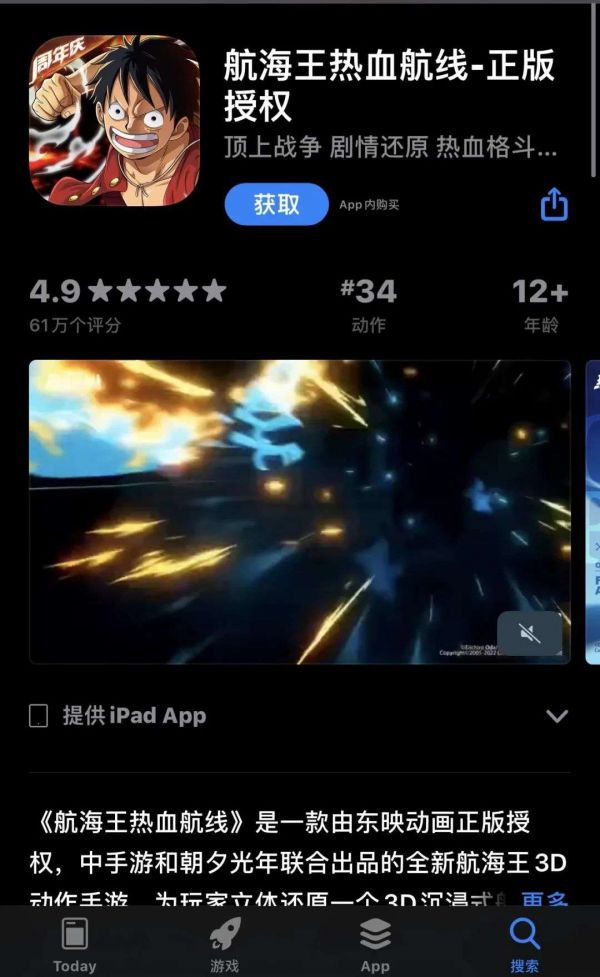 今年4月22日,《航海王热血航线》上线一周年,再次进入了iOS畅销榜前十。截至目前,App Store上超过60万用户给该游戏打出了4.9的评分,是目前市面上航海王IP手游中评分最高的产品。