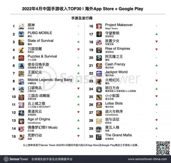 据Sensor Tower每月更新的“中国手游产品在海外市场收入及下载量排行榜”,海外App Store和Google Play今年4月前三名分别是米哈游的《原神》、腾讯的《PUBG MOBILE》和趣加的《State of Survival》,字节的《无尽对决》排名第8。