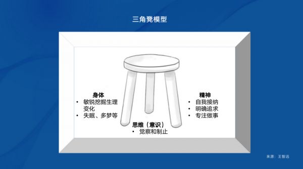 三者构成完美的的三角凳,也就是自我;使用它分为三个步骤:1)觉察,2)制止,3)专注
