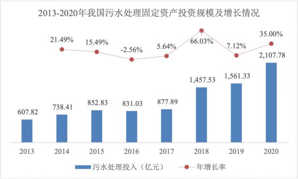 目前水污染治理已成为环保产业中重要的细分行业。根据《2020中国环保产业发展状况报告》数据,2019年在列入统计的环保产业重点企业中,水污染治理行业的收入规模和营业利润分别占环保产业整体比重分别为35.37%和36.04%,位居第二位。而根据住建部发布的数据,我国污水处理固定资产投资规模在2013年为607.82亿元,2020年这一数字已跃升至2,107.78亿元,复合增长率高达19.44%,显著高于环境污染治理领域的整体投资增速水平。