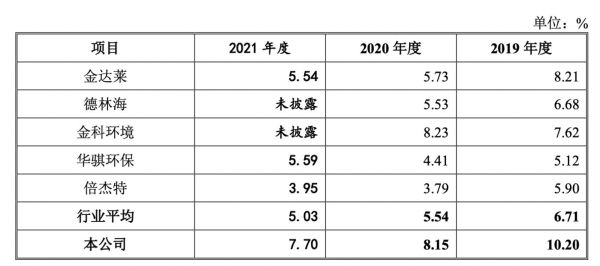 其实,科净源的管理费用一直处于较高益。2019至2021年分别为3,170.51万元、2,618.86万元、3,700.13万元,占营收比例为10.20%、8.15%和7.70%。2021年管理费用较上年增长41.29%,管理费用所占营收比高于同行业可比上市公司平均值(见下图)。