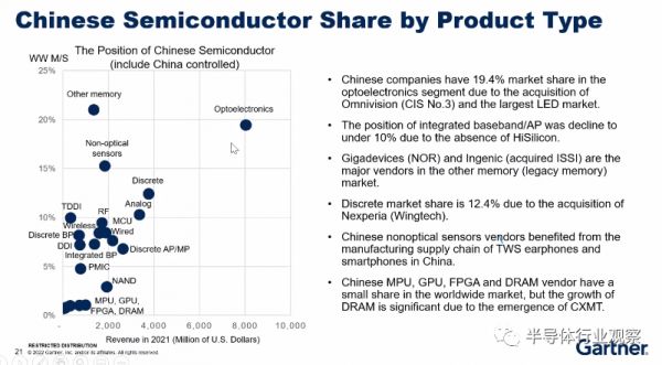 下图是Gartner分析统计的我国在半导体细分领域所占的市场份额情况。以市占10%为基准线,10%以上的市场份额则代表我们在整个市场有一定的话语权和一定的支配力。但我们可以从中看到,市占在10%以上的并不多。细细剖析来看,几个强势的领域大多是通过并购而得以加强。