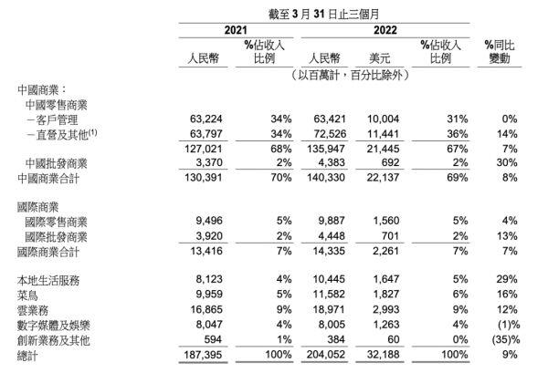 财报就指出,本季营业成本占收入比例从去年同期的66%增加至68%的原因之一是,盒马、天猫超市等直营业务占比提升,导致存货成本占收入比例上升。