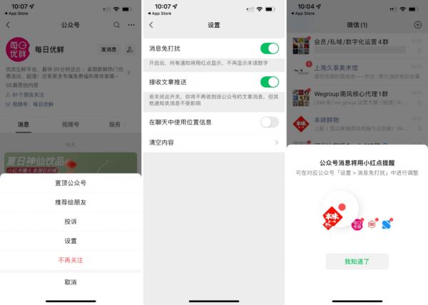 新发布的iOS 微信 v8.0.22 版本,更新了服务号「消息免打扰」功能, 新消息提示变“小红点” ,可以“一键拒收”了!