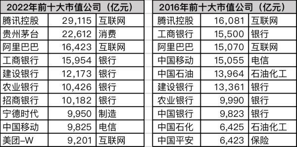 为了系统分析上市公司市值情况以及背后的驱动因素,《读数一帜》整理出了市值排名前十的中国内地公司过去五年的变化情况,评价的范围为内地A股、中国香港以及美股上市的中国内地公司(下同),评价的基准时间点为2022年5月20日以及2016年12月31日。