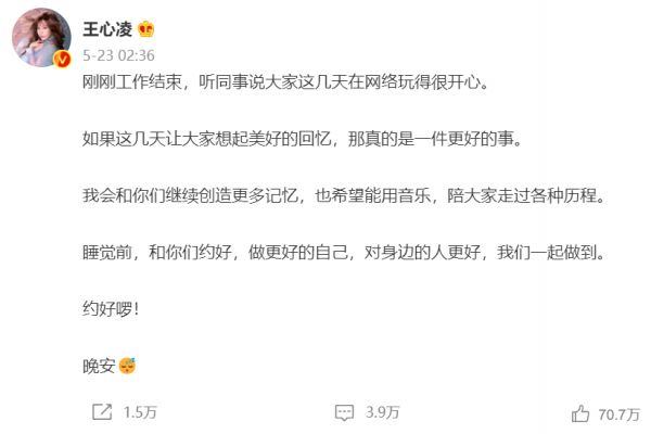 面对突如其来的翻红,王心凌在微博用简体字写道:“听同事说大家这几天在网络玩得很开心。如果这几天让大家想起美好的回忆,那真的是一件更好的事。”