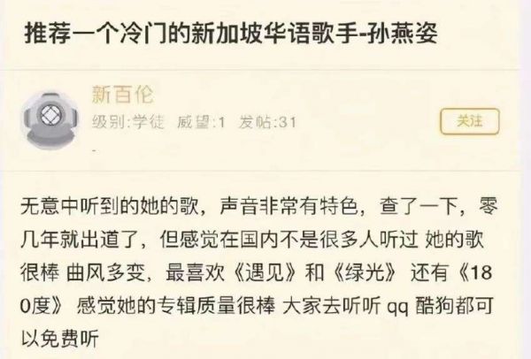 类似的事件在去年再度发生。2021年4月,一名14岁的网友在NGA论坛发帖“给大家推荐一个冷门华语歌手孙燕姿”,被截图搬运、登上热搜,“冷门歌手孙燕姿”迅速成为了戏谑的社交平台新梗,在B站、微博广为流传。