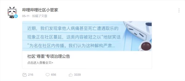 在5月11日发布的《社区“尊重”专项治理公告》中,B站表示将禁止以下三种行为,试行一个月: