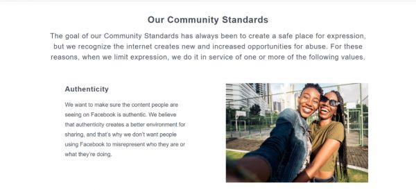 Facebook的社区准则划定了暴力与犯罪、安全、负面内容、诚信与真实、尊重知识产权等几个方向,每个方向下分为若干个议题,每小议题中都有一些用户不能做的,和通常不鼓励用户做、但会视具体情况而定的行为。