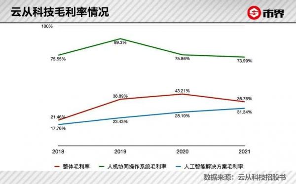 2019年至2021年,云从科技毛利率分别为38.89%、43.21%、36.76%,距离目标还较远。