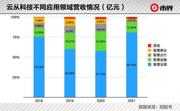 这也体现在云从科技的营收结构中。2018年至2021年,云从科技营收主要来自智慧治理、智慧金融、智慧出行、智慧商业四大领域。其中,智慧治理营收占比最大。