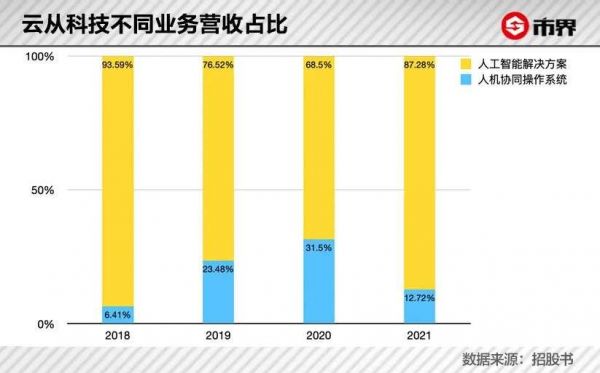 根据招股书,2018年到2021年各期,云从科技人工智能解决方案都是营收的绝对主力,营收占比分别高达93.59%、76.52%、68.5%、87.28%。