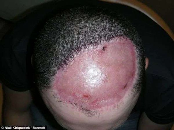两年前,克里斯头顶的脂肪囊肿出现了恶化的风险,他不得不接受了最后一次手术:这一次,医生们去除了全部囊肿组织,作为代价,克里斯失去了直径 23 厘米的头皮,用腿部皮肤移植取而代之。