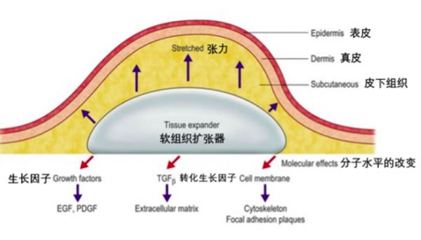 第一,是生物性增生。在扩张机制对皮肤造成的压力下, 细胞会通过有丝分裂增加细胞数量,也会通过增加细胞外基质的合成来增加细胞体积。生物性增长是最重要的一部分,它的比例越大,扩张皮肤的修复效果就越好。
