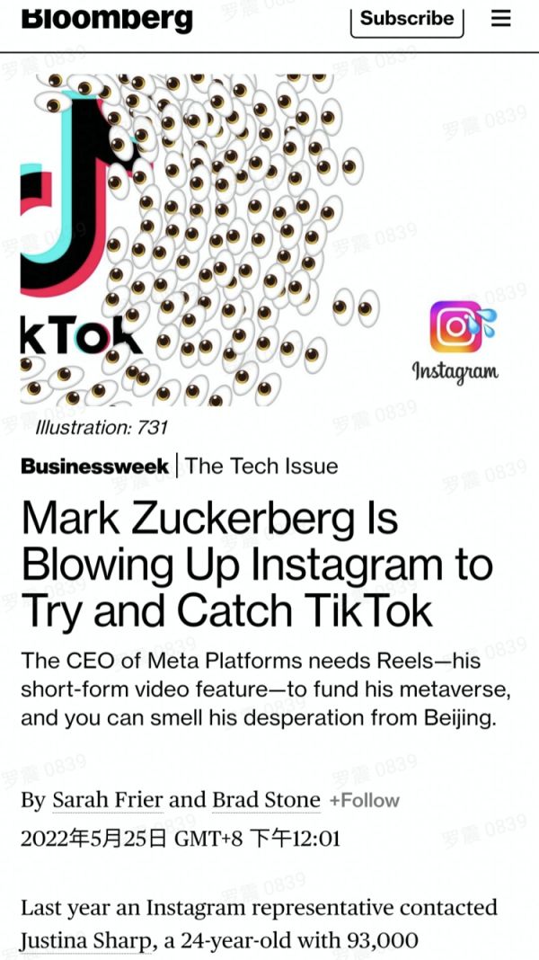 图源:彭博社报道截图 这是彭博周刊在最新一篇报道的开头所描述的场景。 Reels是Instagram母公司Meta推出的短视频应用,文章称,在很多人看来,它就是山寨版的TikTok。 Meta希望创作者们能大量入驻Reels,并逐渐舍弃TikTok,这样年轻人就全被吸引到了Instagram以及Facebook。 发展势头迅猛的TikTok刺痛了Meta的眼睛,而2022年对Meta来说,更是开局不利。 根据这篇报道梳理,年初,Meta核心产品Facebook的日活用户历史性地出现下滑。不看好公司未来前景的投资者们仓皇出逃,Meta股价持续重挫,较之去年高位已跌去47%。 5月23日,Meta首席执行官扎克伯格被美国华盛顿特区总检察长卡尔•拉辛起诉。拉辛表示Facebook涉嫌泄露用户的隐私和数据,而扎克伯格更是深度参与其中。受此影响,Meta股价在周一美股盘后大跌超过7%。 为了扭转颓势,扎克伯格将希望寄托在抄袭TikTok上。