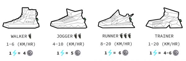 鞋子就分为四种类型,步行鞋、慢跑鞋、跑步鞋、全能鞋,分别要在对应的时速范围内在户外位移才算做有效运动,并且对应的奖励也不同。
