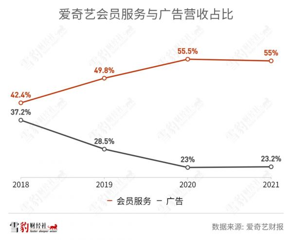 以爱奇艺为例,广告所带来的营收占比远小于会员订阅服务,而且这一差距还在放大。2018年,爱奇艺订阅会员收入、广告收入占比分别为42.4%和37.2%。这一组数字到2021年为55%和23.2%。广告与会员付费两种模式,本就存在一定程度的冲突,在用户对优质内容愈发渴望的趋势下,广告收入只能越来越少。
