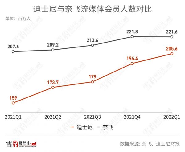 2019年才涉足流媒体平台的迪士尼,用了不到3年就严重威胁到了奈飞。迪士尼流媒体业务订阅总人数为2.05亿,这一数字与奈飞的2.22亿用户量仅一步之距。