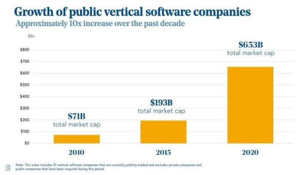 Salesforce 一直是 CRM 领域的最大玩家之一。这种统治地位部分是这个平台能吸引到广大受众的结果。但趋势正在发生变化。为了满足非常特定的受众的需求,各种 SaaS 行业涌现出越来越多的企业。事实上,上市的垂直软件公司市值已经从 2010 年的 710 亿美元上升至 2020 年的 6530 亿美元。
