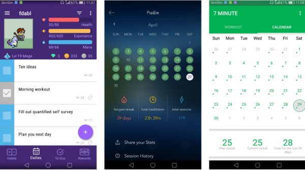 上图从左到右分别是 Habitica、Calm 和 7 Minute 等习惯养成应用的截图。无论使用哪款应用,最重要的是每天坚持,从而在心理上产生让人继续保持向前奋进的做法。