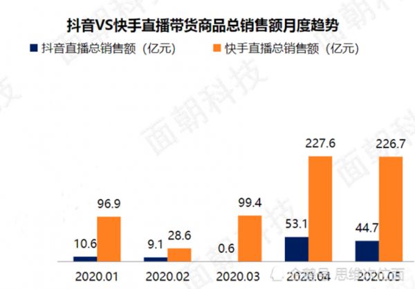 另外面朝科技《2020年直播电商数据报告-抖音VS快手》的报告也显示,2020年1月至5月,快手直播GMV均高于抖音,在电商这样新战场上,快手算是暂时扳回了一城。