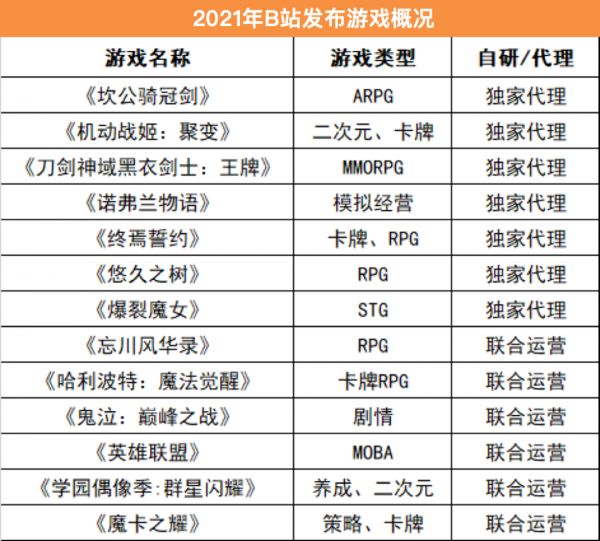 以2018年作为分界线,B站独代、联运业务不断减缓。据DataEye研究院不完全统计,B站2021年在国内上线了13款新游,其中独代游戏7款。