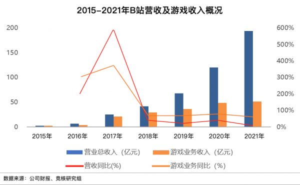 可能存在类比不当,根据头部游戏公司的营收架构来看,1/4左右的游戏收入占比显然很难立起“披着弹幕外衣的游戏公司”这一说法。2021年,腾讯游戏业务收入占总营收31%;更为聚焦的网易这一占比甚至高达72%。