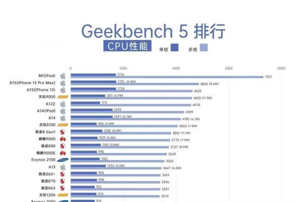 说到底,是其他手机芯片厂商太不给力了。从GeekBench跑分数据来看,A15满血版单核1731分,领先骁龙8 Gen 1约44%,多核4865分,领先骁龙8 Gen 1约28%。倒是GPU部分,高通逐渐追上了苹果。