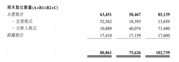 结合此前的财报发现,本次招股书中所说的“附属点位运营商”指的就是加盟商。招股书显示,2019年初,友宝的“附属点位运营商”有2万个,到2021年年底,还有1.8万个。