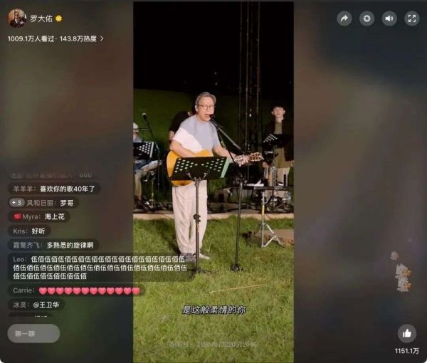 5月27日晚上20点,经过半小时的预热,罗大佑视频号线上演唱会正式开场,在一片草地上,罗大佑弹着吉他,与乐队一起演唱着一首首金曲,《童年》《恋曲1990》《光阴的故事》,在沧桑的歌声中,无数观众梦回青春时代。