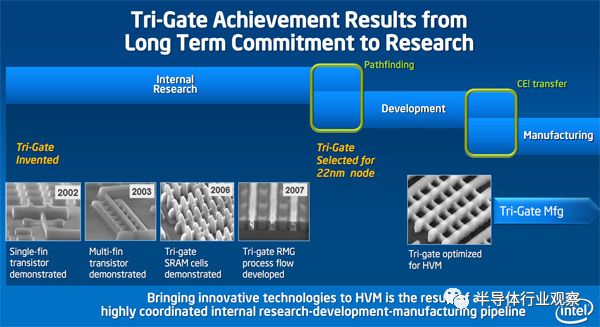 FinFET确切的说,是一个技术的代称。世界上第一个3D三维晶体管是由英特尔在2011年5月宣布研制成功,当时英特尔称其为 “Tri-Gate”( 三栅极晶体管)。早在2002年,英特尔就已经提出了相关技术专利,花了将近10年完善,并在2011年年底用Tri-Gate技术量产22nm工艺的新一代处理器lvy Bridge,于2012年初正式发布。虽然叫法不同,但Tri-Gate的本质就是FinFET。