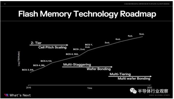 西部数据闪存业务部门负责人、执行副总裁Robert Soderbery在5月投资者活动日中公布了其SSD产品路线图,并预言3D NAND即将进入200+层堆叠,西部数据称其为BiCS+。据介绍,西部数据下一步要推出162层的BiCS6闪存,预计2022年底开始量产采用QLC和TLC配置的BiCS6 3D NAND,而176层的NAND也在制造中。此外,西部数据技术路线图显示将在2032年达到500+层堆叠。