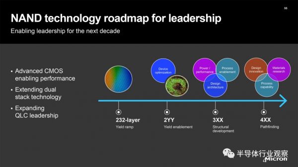 美光近日也发布了业界首个 232 层堆栈的 3D NAND Flash芯片,虽然暂时还没有公布232层3D NAND闪存芯片的具体参数,但可以知道采用的是CuA架构,初始容量为1Tb(128GB),并预计在 2022 年底左右开始量产。美光透露,其正在批量生产176层闪存芯片,而作为第五代3D NAND的此款芯片将在2022年之内完成自己的历史使命。此外,美光还就500层以上闪存制定发展路线图,只是尚未披露具体时间表。