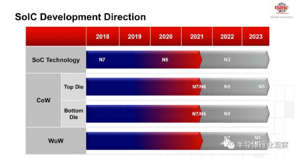 在2021年Hot Chips上,台积电公布了其SoIC研发进度,在CoW方面正在开发N7-on-N7和N5-on-N5等;WoW方面,则在开发Logic-on-DTC,预计2022年CoW和WoW将会实现基于N5工艺。