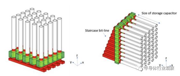 左边是传统的平面DRAM阵列,右边是垂直排列的单元(灰色长管是电容器)。