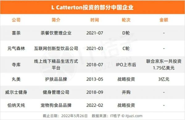 到 2021 年 11 月,L Catterton 参与投资喜茶的 D 轮融资;2022 年 2 月 L Catterton 又投资了宠物狗食品品牌伯纳天纯。据了解,该品牌采用无谷原料,针对不同犬种的胃部消化能力,制造无谷经典犬粮、无谷生鲜犬粮、天然低敏犬粮等,确保宠物的健康饮食,同时为用户提供宠物养护知识,帮助用户养护宠物。