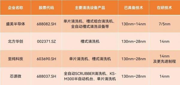 目前四家国产企业均已具备130nm~28nm主流制程清洗设备技术,其中盛美半导体已在研7/5nm清洗设备技术。