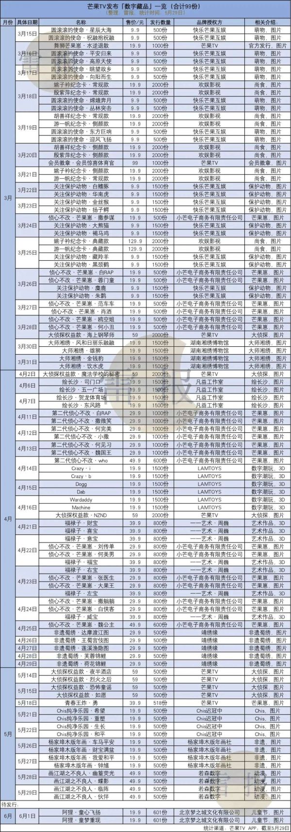 总体来看,芒果TV数字藏品平台发布数字藏品频率相对较高,尤其3月,几乎每日发行,但3-5月,发布藏品数量每月呈递减态势;价格方面为9.9~129.9元不等,其中以9.9或19.9元居多;发售数量500~2000份不等,数字藏品呈现形式多为图片。