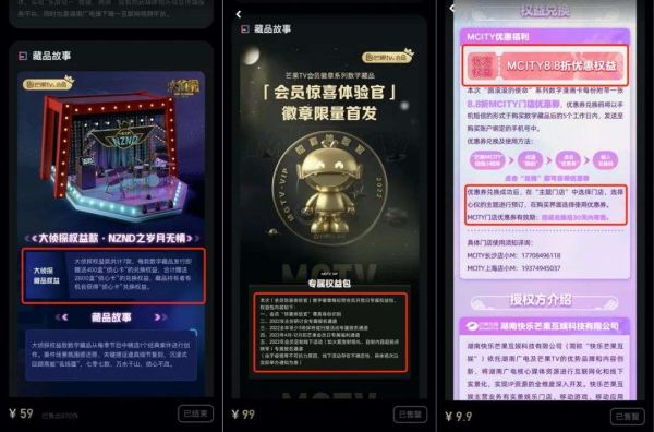 值得一提的是,除了涵盖众多主题类型和IP,及较大程度利用自有或关联IP,芒果TV上发售的部分数字藏品还和平台业务进行权益捆绑,如“圆滚滚的使命”系列数字漫画卡每份附带一张8.8折MCITY店优惠券,可在芒果旗下主题门店进行使用、《尚食》典藏款纪念卡附带芒果TV PC移动影视会员年卡权益、购买售价99元的“会员徽章·会员惊喜体验官”有机会参与主创研讨会,探班、扫楼等活动,以及获得其他专属福利。