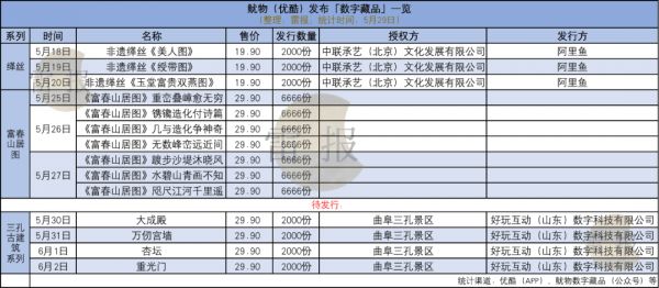 鱿物首发数字藏品于5月18日发售,为“非遗缂丝”系列,包含3款,售价19.9元,分别发行2000份,5月25日~5月27日,该平台又发布了7款“富春山居图”系列数字藏品,单款限量6666份,售价29.9元。